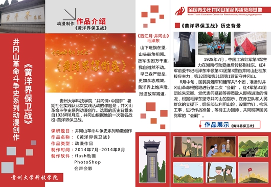 贵大新闻网讯(科技学院 宋洪庆 梁钟宇) “黄洋界上炮声隆,报道敌军宵遁”。这是毛泽东在《西江月•井冈山》词中描写黄洋界保卫战情景的诗句。黄洋界保卫战是第二次国内革命战争时期中国工农红军第四军保卫井冈山革命根据地的一次战斗。为加强革命传统教育,创新传播形式,丰富教育内容,我校科技学院暑期实践团队深入学习领会井冈山精神,深入黄洋界实地考察,最终以《黄洋界保卫战》动漫实践成果,获得2014年“井冈情•中国梦”全国大学生暑期实践活动“优秀实践团队”奖和“优秀课题成果”奖。