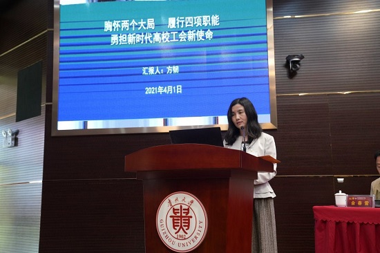 In his keynote speech, Yang Jie acknowledged the Guizhou University union for its arduous and effective efforts in engaging faculty and staff in managing schools affairs in a democratic fashion. Following the recent guidelines from both the university’s Party Committee and Guizhou Education Union, the GZU union has prioritized tasks based on the central missions of the university and has provided the best support services to its faculty and staff. These efforts have helped motivate teachers to utilize their skills to the fullest potential. He then spoke highly of the university’s Party Committee and administrative sectors for their continuous support for the GZU union. In terms of the GZU union’s prioritized tasks, he suggested the following: (a) take a concrete political position; (b) closely review the guidelines; (c) focus on fulfilling Guizhou University’s central missions; (d) consider the best interests of faculty and staff; (e) stay committed to advancing reform and innovation; and (f) respect model workers and carry forward their spirit, honor the value of work, and champion the pursuit of fine workmanship.