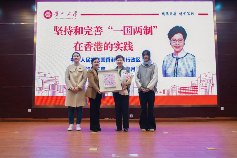 On March 18, Mrs. Carrie Lam Cheng Yuet-ngor, the fifth Chief Executive of the Hong Kong SAR, visited Guizhou University (GZU), where she delivered a keynote speech and engaged in discussions with faculty and students. Attendees included Liu Rui, Deputy Head of the United Front Work Department of the CPC Guizhou Provincial Committee; Bai Zhen, Deputy Director of the Provincial Hong Kong and Macao Affairs Office; GZU leaders Yang Wei, Song Baoan, Zhang Jie, Wang Jinrong, and Chen Yanbo; as well as officials, student and faculty representatives, and around 360 guests from the Hong Kong Chinese Education and Culture Exchange Foundation.