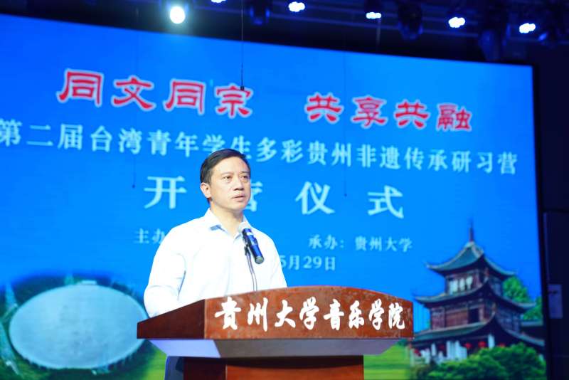On the morning of May 29, the opening ceremony of the second “Taiwan Youth Student Study Camp on Guizhou’s Multicolored Intangible Cultural Heritage” was held at the theater of Yunzheng Building, School of Music, Guizhou University. The event, hosted by the Taiwan Affairs Office of Guizhou Provincial People’s Government and organized by Guizhou University, was attended by Li Weigui, Vice Director of Guizhou Provincial Taiwan Affairs Office; Zhang Dalin, Vice President of Guizhou University; and Sheng Weihao, Secretary-General of the China International Trade Managers Association. Sun Yun, Party Secretary of the School of Music, presided over the ceremony.
