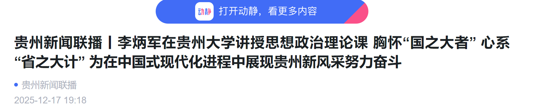 动静新闻客户端:贵州新闻联播丨李炳军在贵州大学讲授思想政治理论课 胸怀“国之大者” 心系“省之大计” 为在中国式现代化进程中展现贵州新风采努力奋斗