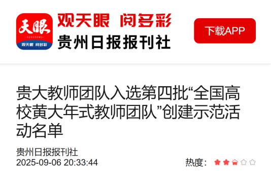 天眼新闻客户端:贵大教师团队入选第四批“全国高校黄大年式教师团队”创建示范活动名单